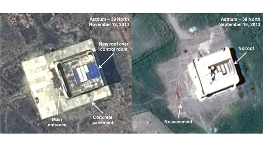 This combination of satellite images taken by Astrium on Nov. 18, 2013, left, and Sept. 16, 2013, and annotated and distributed by 38 North shows what appears to be a rocket assembly building and launch control center at the Tonghae site, located on North Korea's northeast coast.AP/ASTRIUM